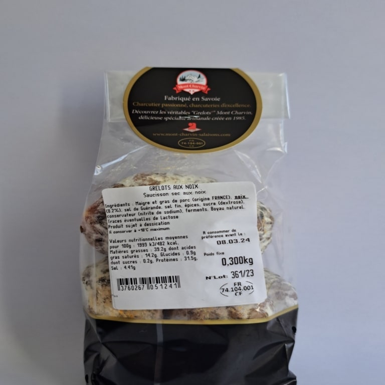 Ingrédients : Maigre et gras de porc (origine France) Noix (8.2%), sel de Guérande, sel fin, épices, sucre (dextrose).